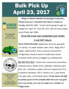 Please have your household bulk items curbside on Sunday, April 23, 2017. Trucks will be going through our Village from April 24 – April 28, 2017 with all items picked up by Friday, April 28th. Click here for copy of flyer!