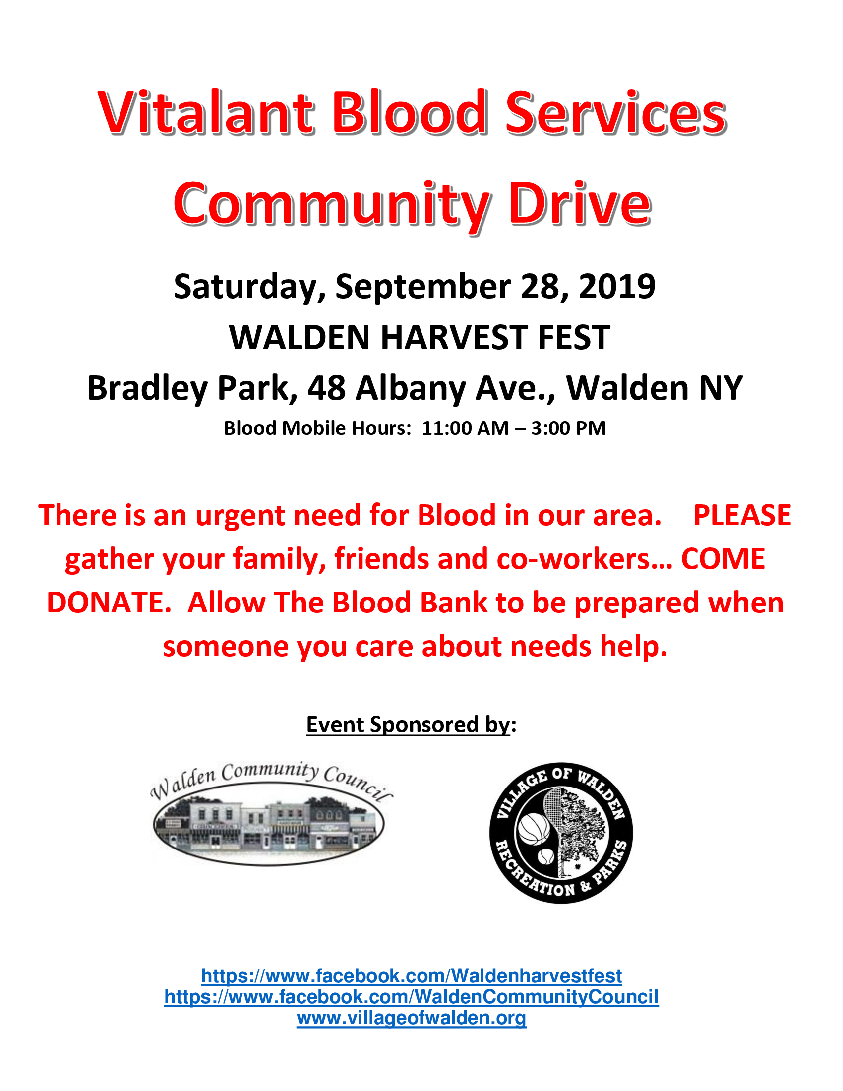Vitalant Blood Services Community Drive, will be at Harvest Fest, located at Bradley Park, 48 Albany Ave, Walden NY.