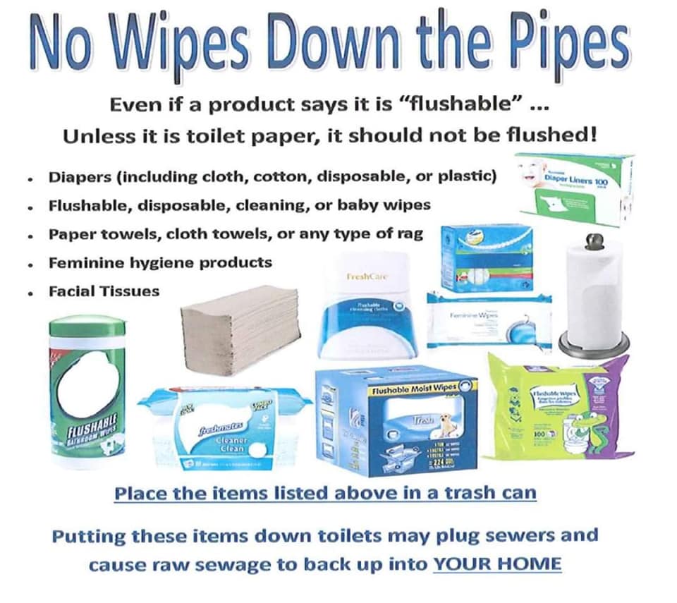 No Wipes Down the Pipes by Marisa | Mar 19, 2020 | Announcements | 0 comments Submit a Comment Cancel replyYour email address will not be published. Required fields are marked *Comment * Name * Email * Website Please enter an answer in digits:16 − 1 =