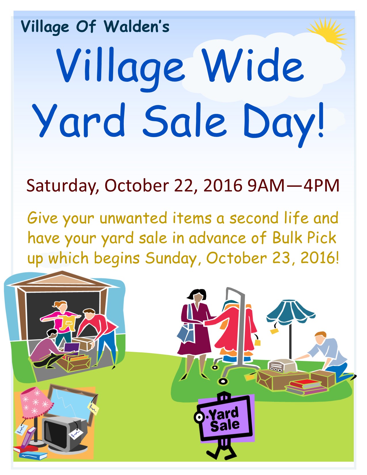 Village Wide Yard Sale Day is set for Saturday, October 22, 2016 from 9am-4pm. Give your unwanted items a second life and have your yard sale in advance of Bulk Pick up which begins Sunday, October 23, 2016!
